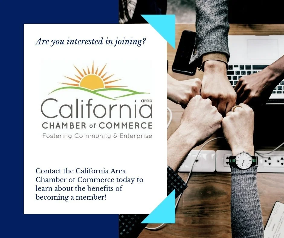 The California Area Chamber will accomplish its mission by implementing programs to meet the needs of our growing Community through teamwork. We will expand our membership by promoting a positive working relationship among businesses and the general public while maintaining an efficient organization that is accountable to each of its members.